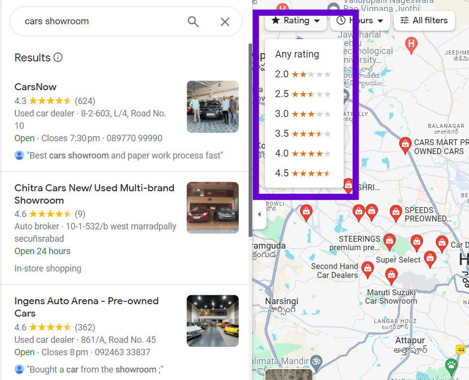 Local businesses have several options available to showcase their business on Google, including Google Places, local map results, and a Google Business Profile page. These platforms can display star ratings, which can significantly impact the consumer’s decision-making process. In fact, consumers can even sort local pack results by their rating, as depicted in the image example below.
